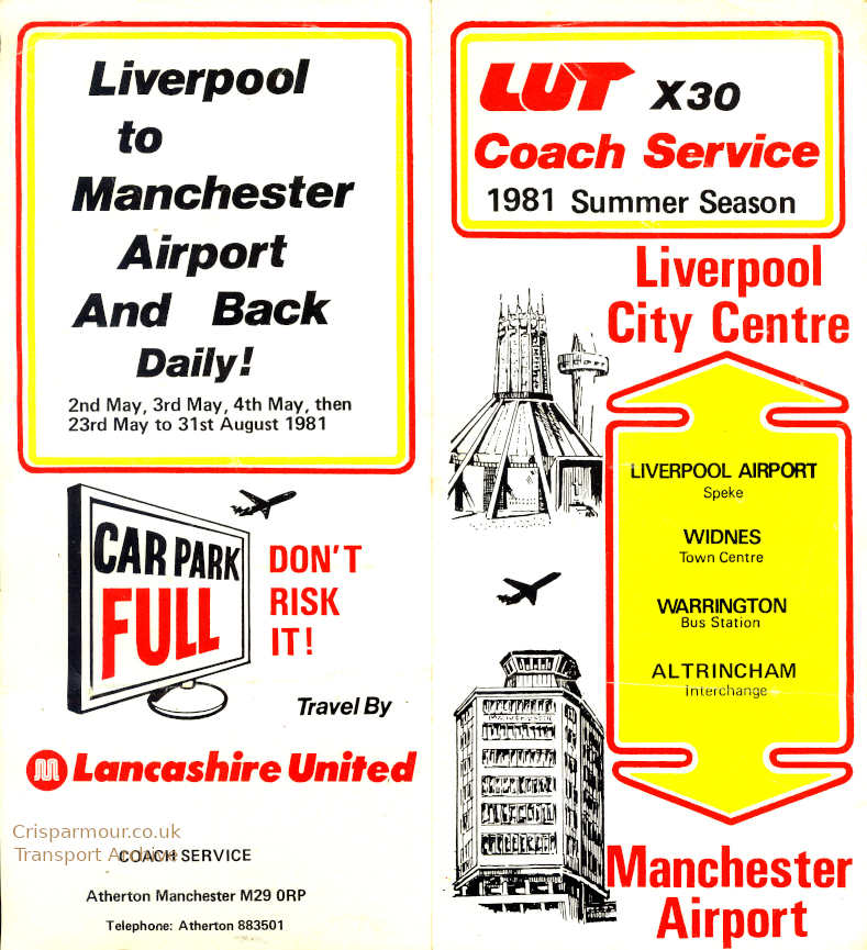 LUT, or Lancashire United Transport, was just hanging onto its identity as a subsidiary of Greater Manchester PTE at its Atherton depot. By the end of 1981 it was no more. But it had been running this service linking Liverpool and Manchester airports for some years and in 1981 was still working at it. The service strangely did not allow for travel from intermediate points to Liverpool, only to Manchester airport. Perhaps this was a condition of its licence, the service travelling through the operating areas of Warrington, Widnes and Crosville into Liverpool Corporation territory.