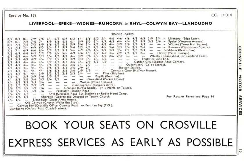 A little while back I showed the cover of the 1956 Crosville summer express timetable given to me by a very kind inspector who kept me chatting for a while at his information kiosk. The most interesting service shown inside has to be the 159 route [“double deck vehicles may be operated on this service”] from Liverpool to the North Wales coast. For it was, as far as I am aware, the only scheduled bus service to cross the Mersey on the Widnes Transporter Bridge. Leaving Liverpool by way of Wavertree, Woolton, Hunts Cross and Speke, the bus served Hale and Widnes before the crossing to Runcorn. There exists a photo of a Bristol LD in service on the Transporter but I do not have the right to reproduce it here. I can suggest a site on which it can be viewed, however.