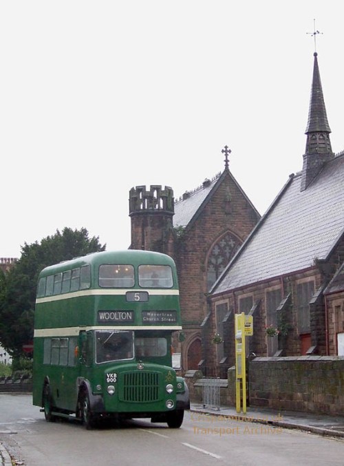 It was a very rainy afternoon. I remember, fifteen years later, that I struggled to keep my camera dry and I discovered I had a hole in the sole of my shoe. But I was rewarded with some pleasant in-service snaps. In the photo above Liverpool Corporation AEC Regent V no. A267 operating route no. 5 has its interior tungsten lighting aglow as the light was starting to fade at 4 p.m.