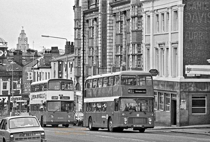 DVL406 was on the Warrington allocation, returning on the H1, one of the three Crosville services from there to Liverpool. This was a long-standing Crosville interurban service in decline: it would cease to exist just over a year later, after deregulation. Prior to the MAP project [which was the National Bus Company’s pre-privatisation exercise to trim away unnecessary mileage and consolidate operations] this service had a 20 minute daytime frequency. After the survey it was reduced to hourly, with a complementary service as far as Widnes and then to Runcorn also operating hourly as H25. The H1 and H25 combined to make a 30 minute frequency between Widnes and Liverpool via Hale. After deregulation, all Crosville main line services along this road became H25 to Runcorn and the H1 was no more.